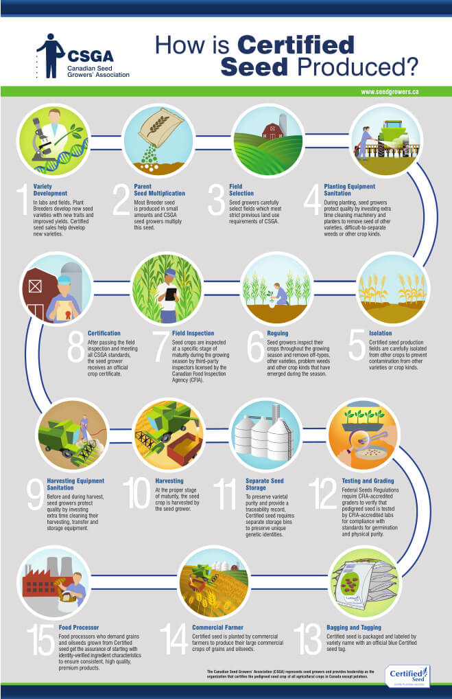 Seed Growers are skilled producers who transfer the technology contained in seed from one generation to the next without allowing impurities or contamination from other varieties or crops. The production of a seed crop must follow strict regulations as set out by the Canadian Seed Growers Association, which is designated in federal Seeds Regulations as the official authority for certifying the pedigree of all agricultural seed crops in Canada (except potatoes). There are about 3,500 seed growers across the country, 15% of whom are in Saskatchewan.